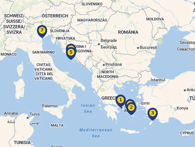 Spoznajte miesta, kde Vaša loď počas plavby zakotví! Každá zastávka je označená číslom, ktoré zodpovedá jej pozícii na mape, aby ste mohli jednoducho sledovať celú trasu. Stačí kliknúť na vybranú destináciu a zistíte viac o každej z nich. Pre ešte lepší prehľad si môžete celý program plavby prezrieť priamo na mape.