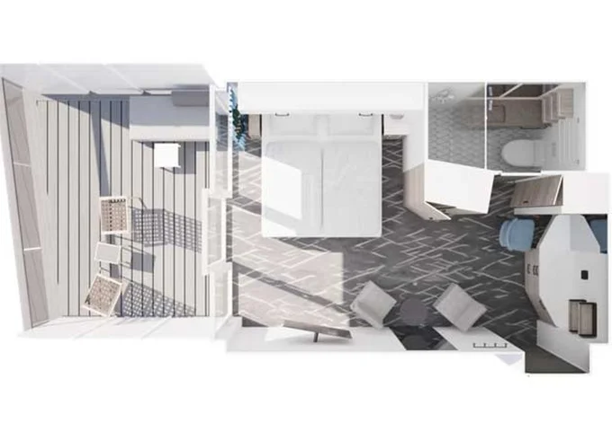 VEKO - Kajuta s terasou 20 m² + balkón 13 m² so stoličkami a váľandou. 15. paluba. Max 2 osoby. 5 638 € 5 638 € za osobu